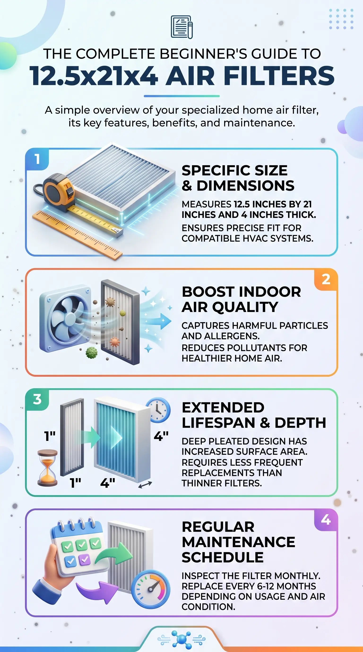 A 12.5x21x4 air filter is a 4-inch-deep pleated HVAC filter that measures roughly 12.5 inches wide by 21 inches tall. The depth is what makes it work. Deep pleats pack in more filtration surface, so this air filter captures more airborne particles and stays in service a lot longer than any standard 1-inch filter you'd pick up at a hardware store.